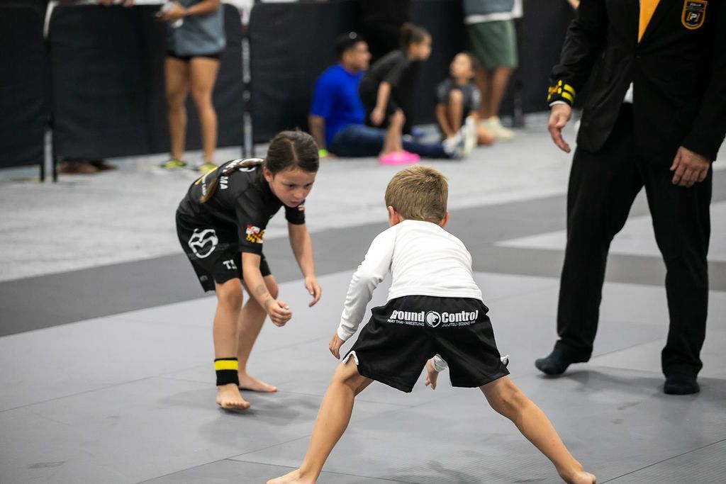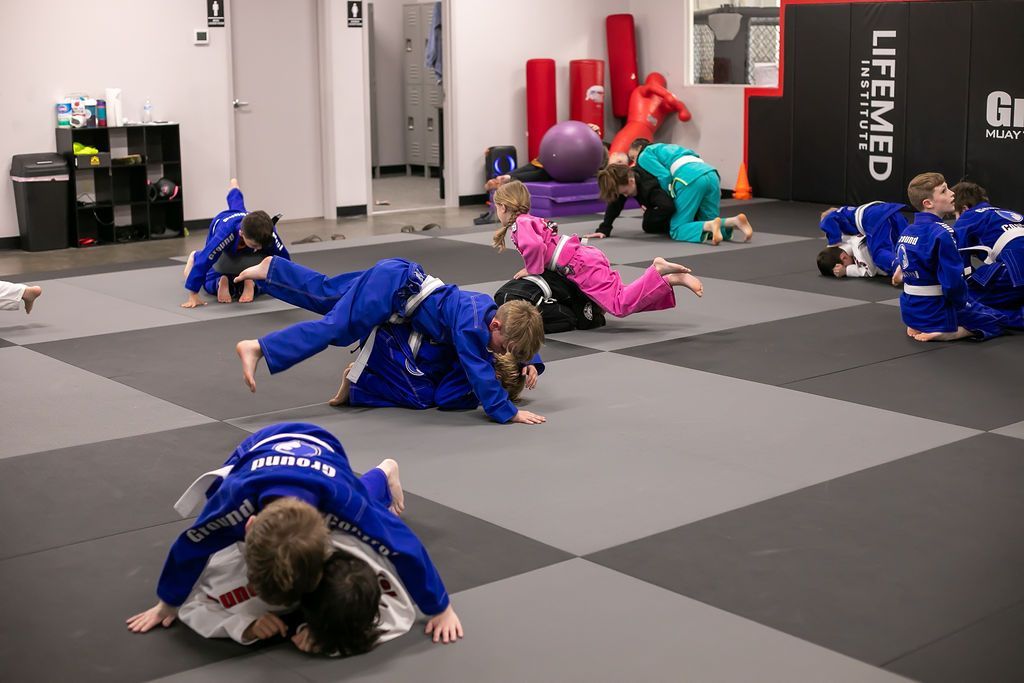 Children in blue and white gis learning Jiu-Jitsu, one instructor guiding a boy on the mat. Gym setting.