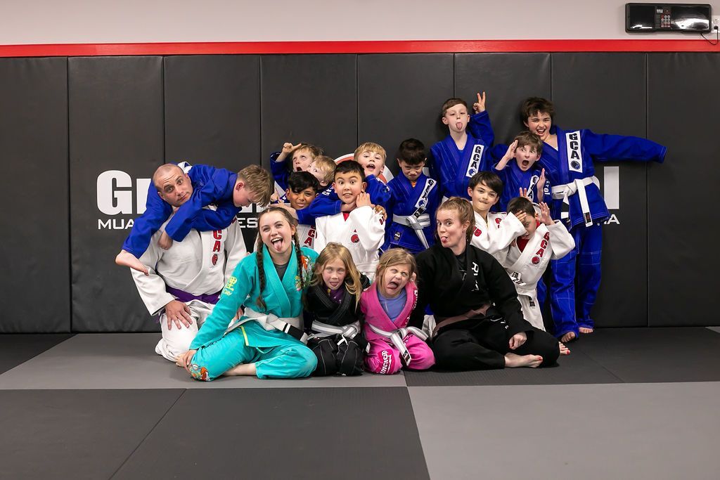 Group of people in a Jiu-Jitsu gym. Some wear white gis, others blue or black. Smiling, posing on the mat.