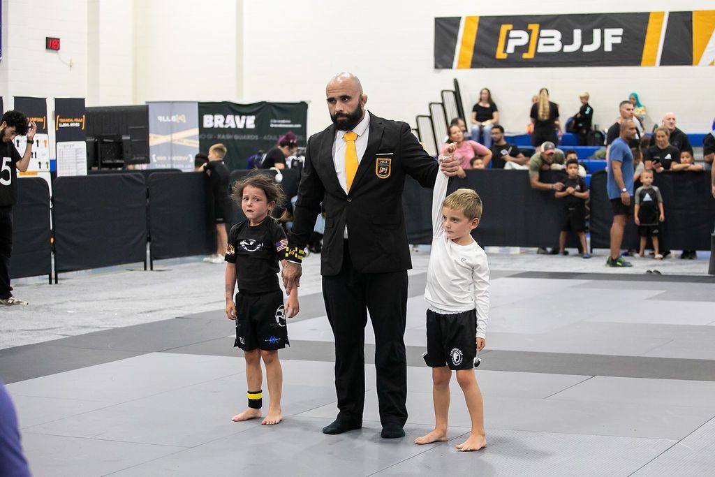 Jiu-jitsu match: Victor in green gi raises arm; opponent in white gi bows. Referee stands between them.