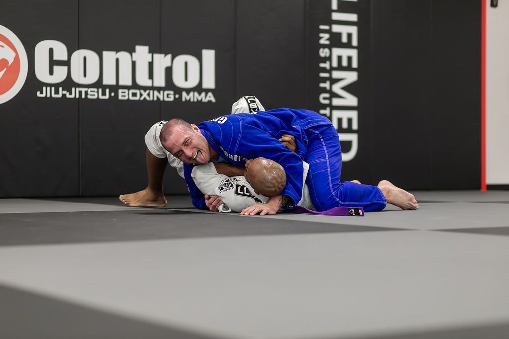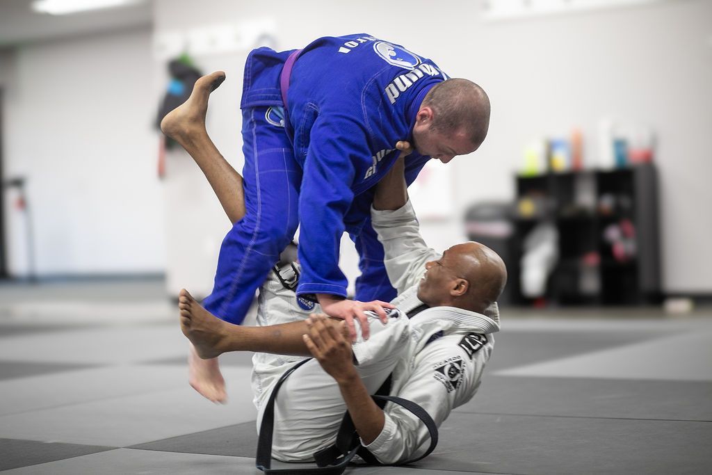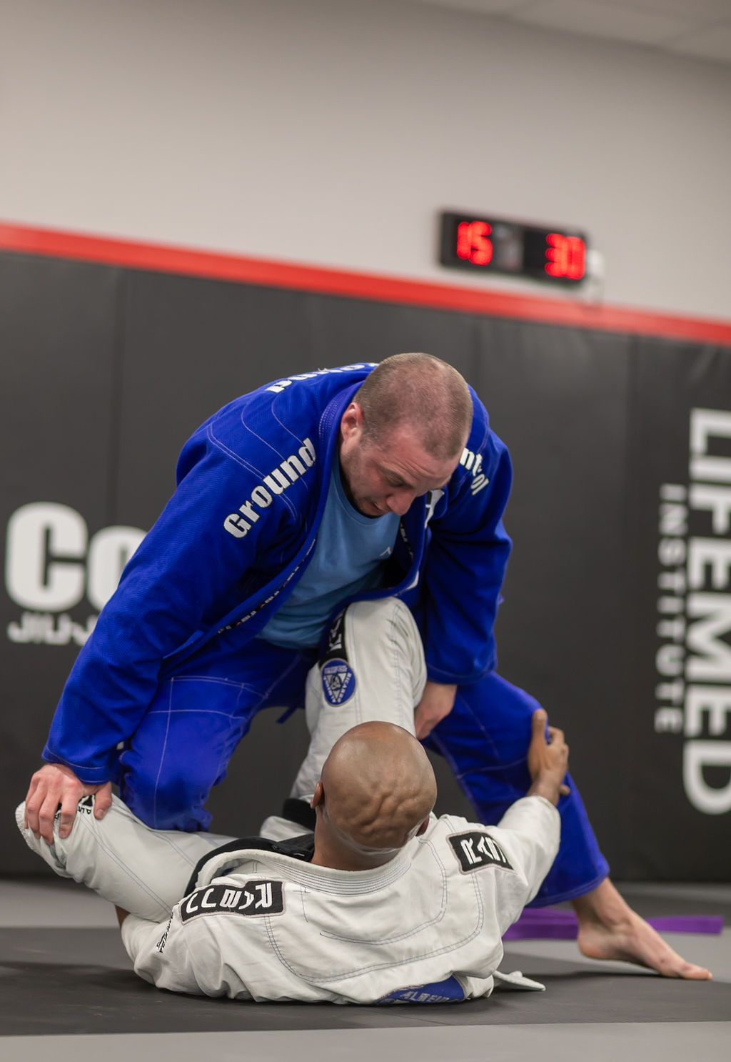 Two men practicing Brazilian Jiu-Jitsu on a mat. One is in a guard position, the other is passing. Ground Control gym.
